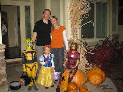 So we "Ghosted" some of our friends. On the second house we "ghosted" we totally got busted. We didn't know that their dead bolt was broken so they opened their garage door. Noah peeked his head around and they saw him. They walked over to where we were huddled together and just looked at us in wonderment, but the funny thing is Connor, their son, totally knew what was going on and ran for the hallow ween treats.